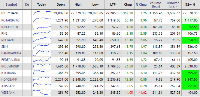 Bank shares are trading higher on the exchanges, with private sector lender Kotak Mahindra Bank leading the rally. Kotak Mahindra Bank shares gained nearly 5% to hit the day's high at Rs 1,331. SBI shares are trading 2% higher at Rs 296.85, while IndusInd Bank shares zoomed 1.5% to Rs 1,709. HDFC Bank shares gained nearly 1% in the morning, to hit Rs 1,980.60. The rally in the shares are propelling Bank Nifty higher as the index is up more than 362 points to 28,990.95. ICICI Bank, Axis Bank, HDFC Bank have hit a fresh 52-week high.