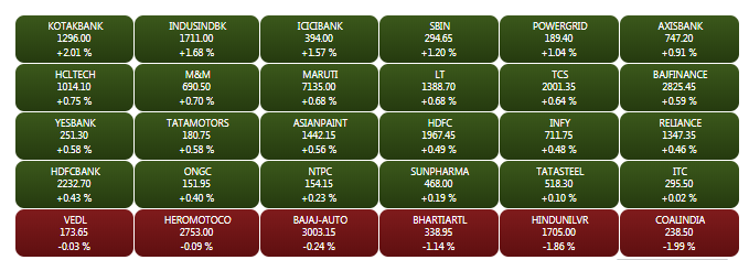 After opened marginally higher on Friday morning, the Sensex and Nifty extended gains in the afternoon trade led by rally in bank shares. The Sensex has reclaimed the crucial 38,000-mark, while Nifty is trading firmly above the 11,400-mark. Bank shares are trading higher on the exchanges, with private sector lender Kotak Mahindra Bank leading the rally. Kotak Mahindra Bank shares gained nearly 5% to hit the day's high at Rs 1,331. SBI shares are trading 2% higher at Rs 296.85, while IndusInd Bank shares zoomed 1.5% to Rs 1,709. A look at LIVE Sensex heatmmap.
