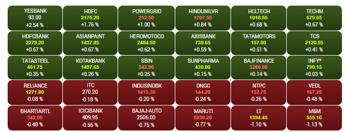 The headline indices Sensex and Nifty opened higher on Wednesday morning tracking global cues. The Sensex is up 100 points to 38,082, while the Nifty is trading near the 11,350-mark. Yes Bank, HDFC shares are among the biggest gainers, jumping up to 3%. L&T, M&M are down by more than 1% each. A look at LIVE Sensex heatmap.