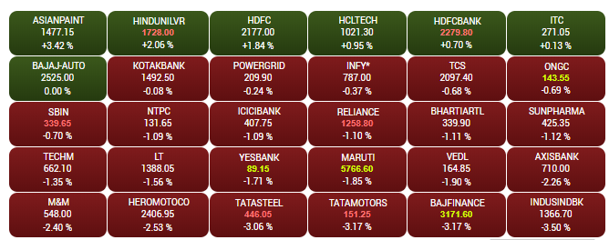 After opening higher, the headline indices Sensex and Nifty pared gains on Wednesday after, led by a sell-off in financial heavyweights. The Sensex ended 135 points down at 37,847.65 while the Nifty ended below the 11,300-mark. IndusInd Bank, Bajaj Finance, Tata Motors were among the biggest losers, shedding up to 4%. Asian Paints, HUL, HDFC were the biggest gainers, jumping up to 3.5%. A look at LIVE Sensex heatmap.