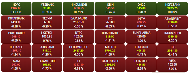 After opening higher, the headline indices Sensex and Nifty pared gains on Wednesday morning tracking global cues. The Sensex is down 230 points to 37,753 while the Nifty is trading below the 11,250-mark. Yes Bank, HDFC shares are among the biggest gainers, jumping up to 3%. L&T, M&M are down by more than 1% each. A look at LIVE Sensex heatmap.