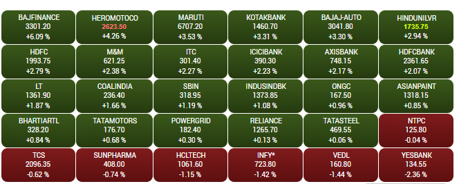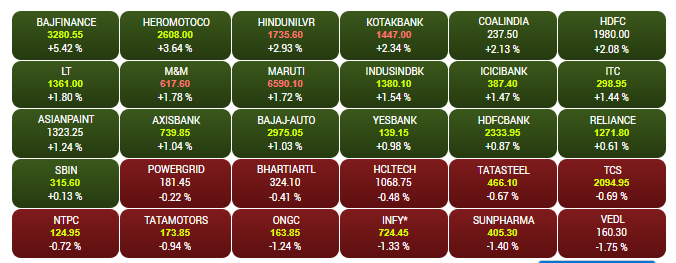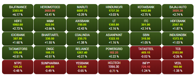 After opening higher, the Sensex and Nifty extended gains in the afternoon trade on Friday, tracking mixed global cues. The Sensex is up about 343 points to 37,736.80, while the Nifty is trading above the 11,350-mark. Bajaj Finance shares are trading 5.6% higher at Rs 3,284.75 while Heromotocorp shares are trading 3.6% higher at Rs 2,607.55, to emerge among the biggest Sensex gainers. A look at LIVE Sensex heatmap.