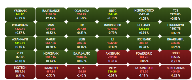 The Sensex and Nifty opened marginally higher on Friday morning, tracking mixed global cues. The Sensex is up about 200 points to 37,593.48, while the Nifty is nearing the 11,300-mark. Yes Bank shares are trading 4% higher at Rs 143, while Bajaj Finance shares are up about 2.1% to Rs 3,177.90. Sun Pharma, Tata Motors shares are among the biggest losers, shedding up to 1%. A look at LIVE Sensex heatmap.
