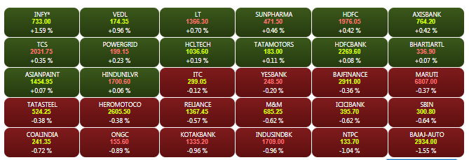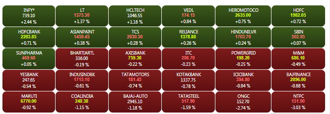 The stock markets-- Sensex and Nifty--are trading marginally higher on Wednesday morning, tracking weak global cues. The Sensex is up 73 points to 38,436.07, while the Nifty is trading near the 11,550-mark. Infosys shares are trading 2.6% higher at Rs 740, while L&T shares gained nearly 2% to Rs 1,380.50, to emerge among the biggest Sensex gainers. Shares of Anil Ambani-led Reliance Communications jumped by nearly 10% to hit the day's high at Rs 4.80, after the firm paid its dues to Ericsson per a Supreme Court order. A look at LIVE Sensex heatmap.
