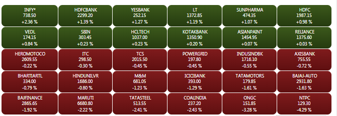 Share market Highlights: The stock markets– Sensex and Nifty–closed flat on Wednesday, holding on to 6-month highs. The Sensex ended 23 points higher at 38,386.75, while the Nifty closed above the 11,500-mark. Infosys shares ended 2.3% higher at 738.40, while L&T share price jumped 1.7% to Rs 1,380.10.