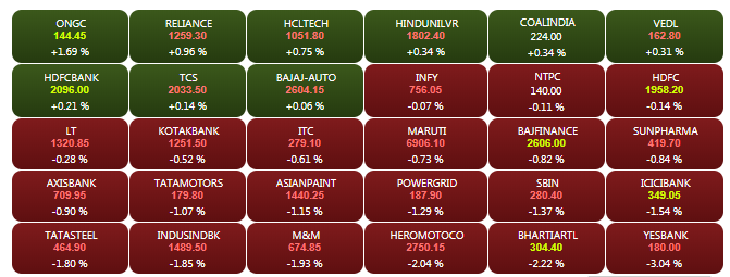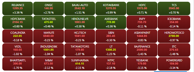 The domestic stock markets –Sensex and Nifty–opened lower on Monday, tracking weak global cues. The Sensex is down about 100 points to 36,369.43 while the Nifty is trading below the 10,850-mark. Yes Bank share price slumped by more than 5% to Rs 175.60, while Heromotocorp shares tanked by more than 3% to Rs 2,720 in the morning trade. A look at LIVE Sensex heatmap.