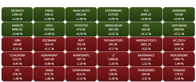 The Sensex and Nifty made a smart recovery in the afternoon trade on Monday, on the back of a rally in blupechip heavyweights. The Sensex closed 113.31 points higher at 36,582.74 while the Nifty ended above the 10,900-mark. Shares of billionaire Mukesh Ambani-led Reliance Industries closed 3.5% higher at Rs 1,290.93 to emerge as the biggest gainer in the Sensex. Shares of Anil Ambani-led Reliance Communications plunged in trade on Monday, after the firm filed for insolvency on Friday. RCom shares closed 35% lower at Rs 7.55 on NSE. A look at LIVE Sensex heatmap.