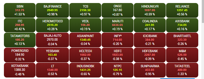 The Sensex and Nifty opened lower on Monday morning, tracking weak global cues. The Sensex is down about 100 points to 37,362.99, while the Nifty is trading near the 11,250-mark. SBI shares are up 1.8% to Rs 313.50, while ONGC shares are trading 0.6% higher at Rs 167.80 to emerge among the biggest Sensex gainers. Tata Steel shares are down 2% to Rs 478.80, while Kotak Mahindra shares are down by 0.5%. A look at LIVE Sensex heatmap.