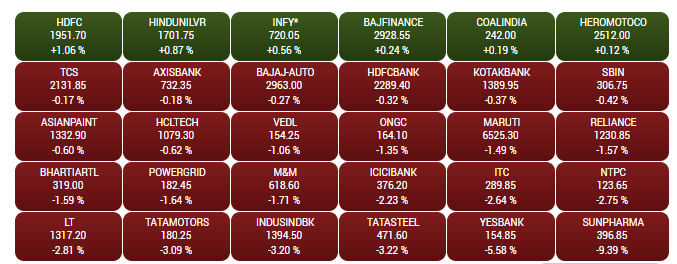 The Sensex and Nifty extended losses in the afternoon trade on Monday, tracking global cues. The Sensex ended 372 points down to 37,090.82, while the Nifty closed below the 11,150-mark. Sun Pharma shares tanked by more than 9.4% to Rs 396.85, while Yes Bank shares closed 5.6% down at Rs 154.85, to emerge among the biggest Sensex losers. A look at Sensex heatmap at close.