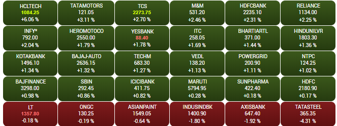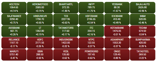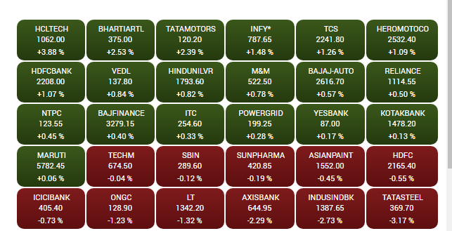 The headline indices Sensex and Nifty opened higher tracking global cues. The Sensex is up 170 points to 36,860, while the Nifty is trading near the 10,900-mark. Heromotocorp, HCL Tech, Yes Bank are among the biggest gainers jumping up to 3%. A look at LIVE Sensex heatmap.