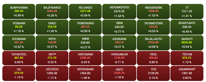 After opening lower, the headline indices-- Sensex and Nifty-- recovered losses in the afternoon trade on Tuesday to close in the green. The Sensex emded 10.25 points higher at 38,730.82, while the Nifty closed above the 11,550-mark. Bajaj Finance, Sun Pharma shares were among the biggest gainers, jumping more than 5% each. IT behemolth TCS is all set to report Q1 earnings today, kicking of the results season this quarter. A look at LIVE Sensex heatmap.