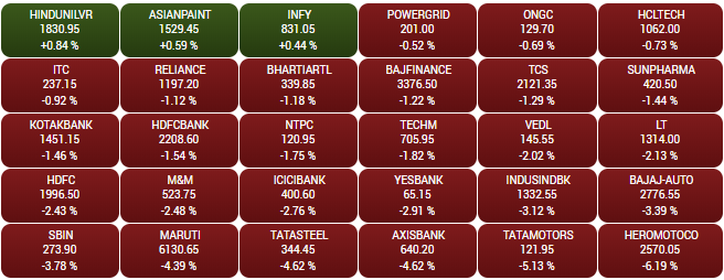 The headline indices Sensex and Nifty extended losses on Tuesday afternoon, a day after crude oil shock roiled global markets following Saudi oil attack. The Sensex closed 642 points down to 36,481, while the Nifty closed near the 10,800-mark. Tata Motors, Heromotocorp, Axis Bank emerged among the biggest losers in the Sensex, shedding up to 6%. HUL, Asian Paints and Infosys were the only gainers in the index. A look at LIVE Sensex heatmap.