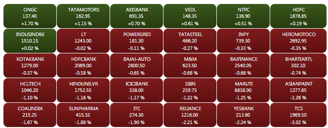 The headline indices- Sensex and Nifty extended losses in the afternoon trade on Monday, tracking mixed global cues. The Sensex closed 311 points down to 35,498.44, while the Nifty ended 95 points down at 10,630.15. Yes Bank shares closed 2.24% lower at Rs 213.80 on BSE, after the Reserve Bank of India warned of regulatory action for disclosure of nil divergence report in violation of the confidentiality clause. TCS shares closed 3% lower at Rs 1,969.50, emerging among the biggest Sensex losers. A look at LIVE Sensex heatmap.