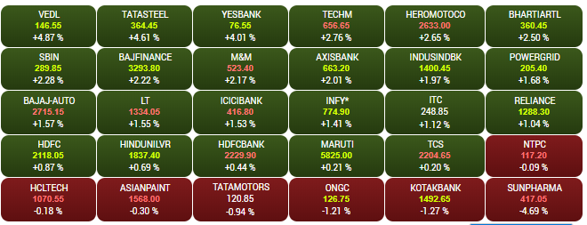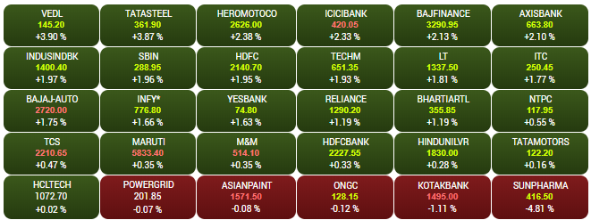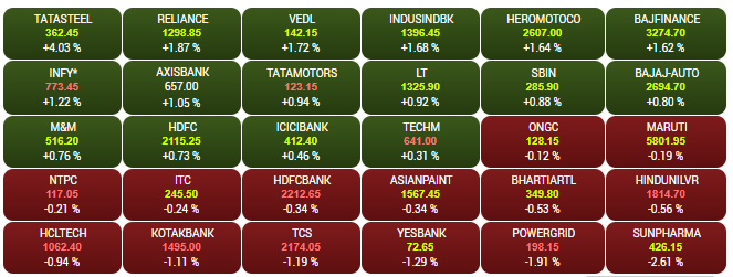 After opening higher, the headline indices Sensex and Nifty extended gains in the morning trade on Wednesday. The Sensex is up about 406 points to 37,364.50, while the Nifty is trading above the 11,000-mark. Tata Steel, RIL shares were among the biggest gainers, jumping up to 4%. A look at LIVE Sensex heatmap.