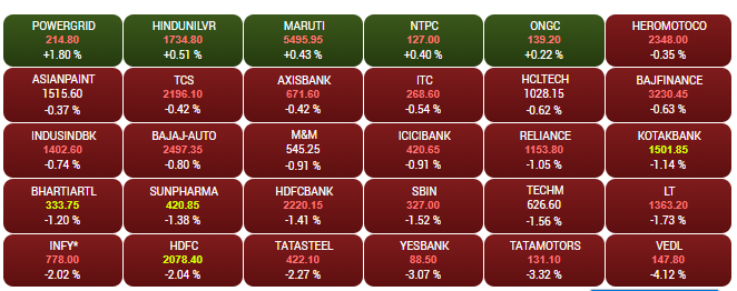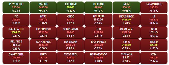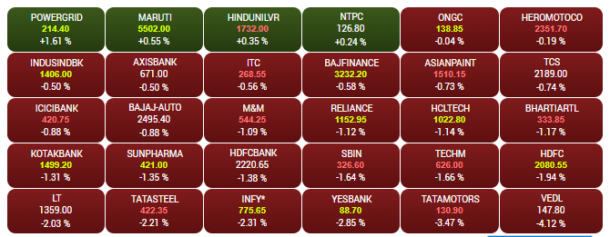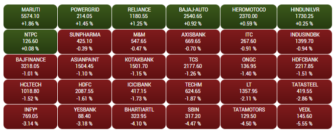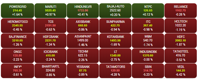 After opening lower, the headline indices Sensex and Nifty extended losses in the late morning trade on Thursday, tracking global markets sell-off. The Sensex is down 615 points to 36,865.50 while the Nifty is trading below the 11,000-mark. Zee Entertainment shares slumped by more than 6.3% to Rs 336 after the firm announced that after Oppenheimer Development fund agreed to pick up 11 per cent of promoter stake in the firm for Rs 4,224 crore. A look at LIVE Sensex heatmap.