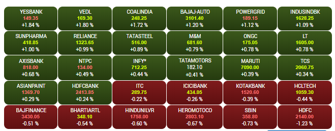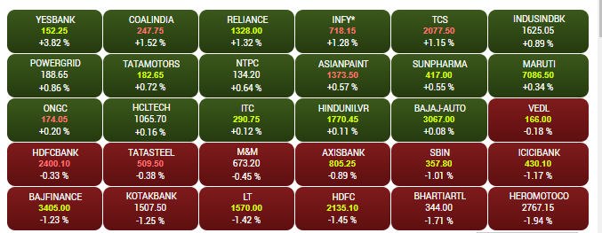 The Sensex and Nifty opened mildly higher on Tuesday morning, tracking global cues. The Sensex is up about 70 points to 37,747.76, while the Nifty is trading above the 11,900-mark. Yes Bank, Tata Motors shares are among the top gainers, trading up to 2.5% higher. A look at LIVE Sensex heatmap.