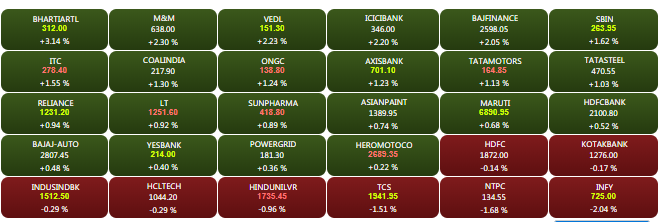 The headline indices--Sensex and Nifty-- extended gains in the morning trade on Tuesday, tracking global cues. The Sensex is up 167 points to 35,656.56, while the Nifty is trading above the 10,650-mark. Bharti Airtel shares gained more than 3% to Rs 312 in the morning, trade while M&M shares are trading 2.5% higher at Rs 638 on BSE, to emerge among the top Sensex gainers. A look at LIVE Sensex heatmap.