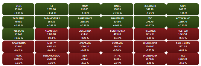 After opening mildly higher, the headline indices--Sensex and Nifty-- turned choppy in the afternoon trade on Tuesday, tracking mixed cues. The Sensex closed 146 points lower at 35,352.61, while the Nifty ended below the 10,600-mark. TCS shares closed 3.5% lower at Rs 1,902.30 on BSE, while Infosys shares ended the session 2.1% lower at Rs 724.55 The IT majors have emerged among the top losers in Sensex for the day. A look at LIVE Sensen heatmap.