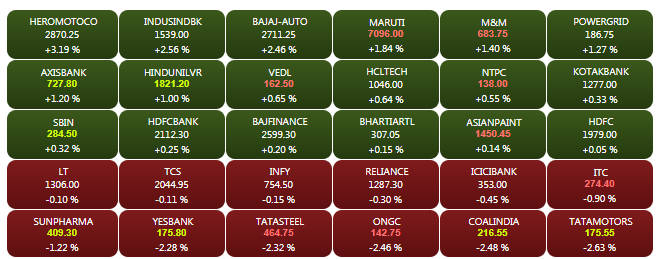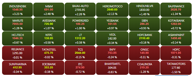 Sensex and Nifty rebounded in the afternoon trade on Tuesday, backed by a rally in bluechip stocks. The Sensex closed 34 points higher at 36,616.81, while the Nifty closed below the 10,950-mark. IndusInd Bank shares closed 2.5% higher at Rs 1,539.50 on BSE, while Heromotocorp shares closed 3.2% higher at Rs 2,870.25, to energe among the biggest Sensex gainers. A look at LIVE Sensex heatmap.
