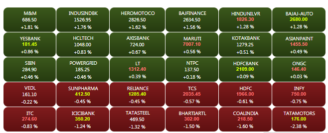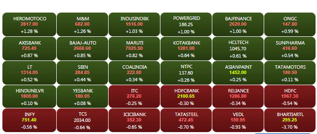 After turning choppy--Sensex and Nifty-- rebounded in the afternoon trade on Tuesday. The Sensex is up 73 points to 36,666.25, while the Nifty is nearing the 10,950-mark. IndusInd Bank shares zoomed by more than 3% to Rs 1,549.50 on NSE. M&M shares zoomed by more than 2.4% to Rs 690.50, to emerge among the biggest Sensex gainers. Tata Motors shares slumped more than 2.7% to Rs 175.25, while Tata Steel shares tanked more than 1.5% to Rs 468.50, to emerge among the biggest losers in the Sensex. A look at LIVE Sensex heatmap.