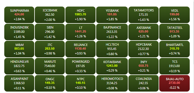 After extended rally in the morning trade, Sensex and Nifty are holding on to gains tracking positive global cues. Sensex is trading 340 points higher at 36,147.62, while Nifty is trading near the 10,900-mark. Sun Pharma shares gained by more than 3.6% to hit the day's high at 426. ICICI Bank share price zoomed by more than 2% to Rs 362.80. The rally is being led by financials and auto stocks. A look at Sensex live heatmap.
