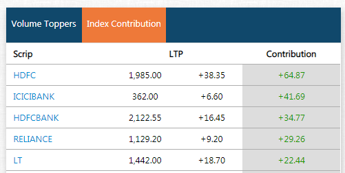 Even as Sensex continues to hold on to gains from the morning trade, bluechips HDFC twins, ICICI Bank have emerged among the top gainers in the index. HDFC shares are trading 2% higher at 1,985, while HDFC Bank share price are trading at Rs 2,132, about 1% higher. ICICI Bank shares too are trading with gains of more than 1.8% at Rs 362. A look at top 5 Sensex contributors.