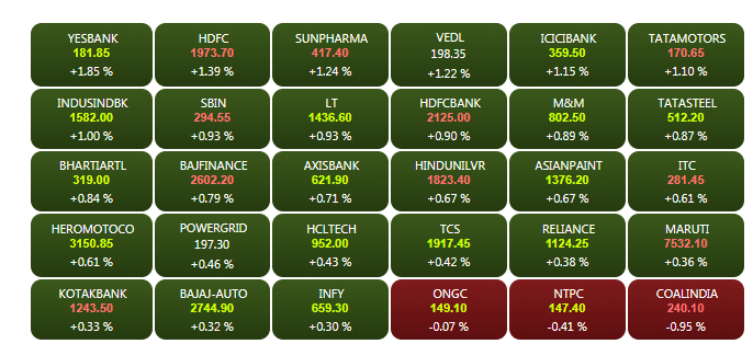 Sensex and Nifty opened higher tracking on Friday global cues, after Asian equities were mixed in trade, and US markets ended in the green. Sensex zoomed more than 220 pts to 36,027.79, while the broader Nifty 50 was trading above 10,800. Yes Bank share price gained by more than 2.1% to Rs 182, while ICICI Bank shares zoomed 1.3% to Rs 360.20. The rally was being led by financials, pharma and auto stocks. A look at Sensex live heatmap.