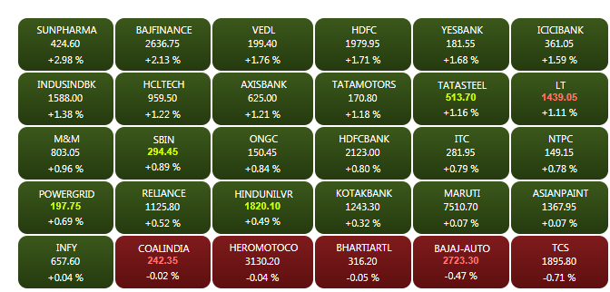 After extended rally in the morning trade, Sensex and Nifty are holding on to gains tracking positive global cues. Sensex is trading 340 points higher at 36,147.62, while Nifty is trading near the 10,900-mark. Sun Pharma shares gained by more than 3.6% to hit the day's high at 426. ICICI Bank share price zoomed by more than 2% to Rs 362.80. The rally is being led by financials and auto stocks. A look at Sensex live heatmap.