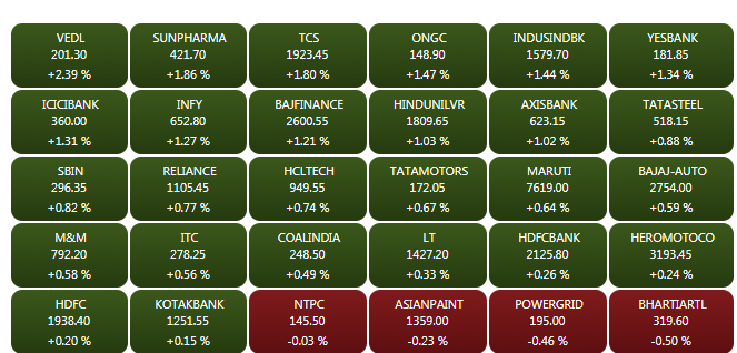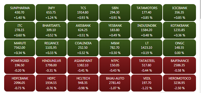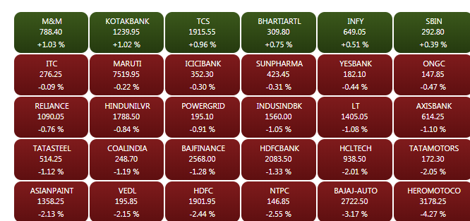 After opening opening mildly higher, Sensex and Nifty turned choppy in the early trade on Monday, tracking weak global cues. The Sensex is down about 60 points to 35,680.63, while the Nifty 50 is trading above the 10,750 level. Shares of Infosys gained by more than 1.1% to Rs 658, while shares of Bharti Airtel were up by more nearly 1.1% to Rs 312.30 on the BSE. A look at live Sensex heatmap.
