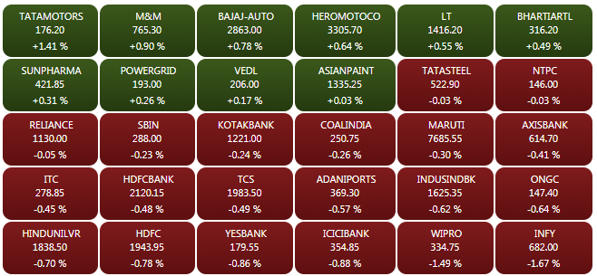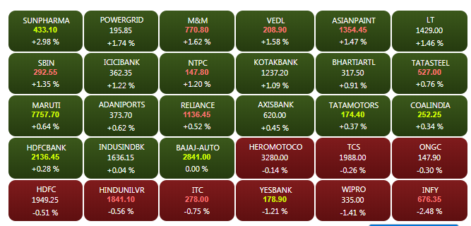 After opening lower, amid weak global cues, Sensex and Nifty reversed losses on Tuesday afternoon led by a rally in the shares of Tata Motors and Sun Pharma. Sensex is trading 92 points higher at 36,362.83, while the Nifty 50 is trading above the 10,900-level.  Sun Pharma share price gained more than 3% to hit Rs 434 on the index. A look at live heatmap.