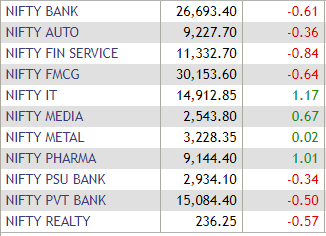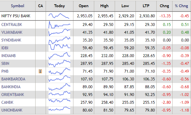 The Nifty PSU Bank index traded with losses of 0.45%, with most PSU bank shares in the red. SBI was trading lower by 0.47%. However, shares of Central Bank of India and Vijaya Bank were trading marginally higher. Check out the stock here: