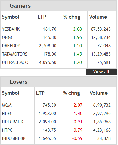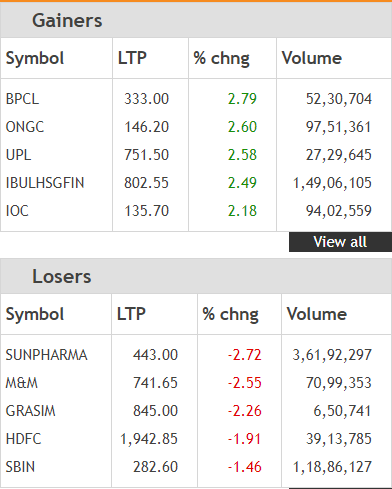 The BSE Sensex closed 106.69 points or 0.29% lower at 36,134.31 points. Sun Pharma, M&M, HDFC, SBI, NTPC and InduInd Bank were the top Sensex losers today. On the National Stock Exchange, the Nifty closed Tuesday’s trade 14.25 points or 0.13% lower at 10,869.50 points. Bank Nifty ended lower by 0.61%. BPCL, ONGC, UPL, Indiabulls Housing Finance and IOC were the top gainers on the Nifty, while Sun Pharma, M&M, Grasim, HDFC and SBI were the top losers.