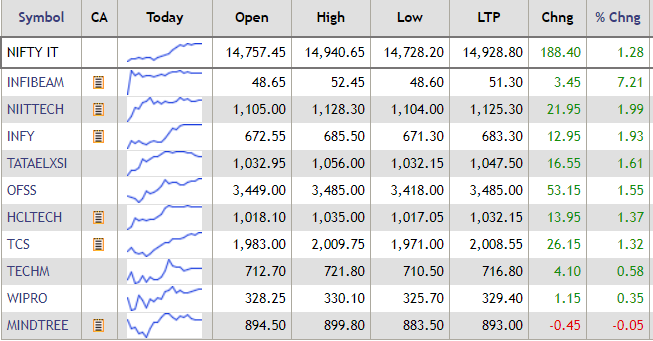 The Nifty IT index traded with gains today, with shares of Infibeam Avenues up over 7% during the mid-morning trade deals. Mindtree was the only loser on the IT index. Infosys and HCL Technologies gained over 1% each.