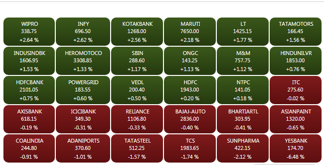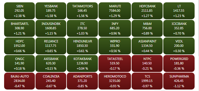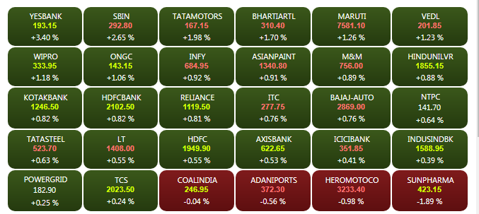 Sensex is holding on to morning gains, up about 250 pts. Yes Bank share price gained more than 4% to hit Rs 194.30, ahead of its board meet scheduled later today. Sun Pharma share price slumped 3% after SEBI Chairman Ajay Tyagi said yesterday that the regulator is examining a whistle blower complaint. A look at live heat map.