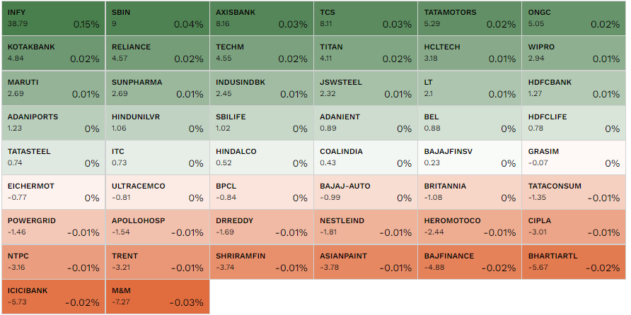 At 12:30 on the NSE, Infosys led the gainers with an increase of 2.74%, followed by ONGC at 2.17%, Tata Motors at 2.07%, JSW Steel at 2.07%, and Tech Mahindra at 1.98%. Conversely, the top losers included Shriram Finance, which fell by 1.56%, Cipla down by 1.44%, Hero Motocorp declining by 1.42%, Trent decreasing by 1.09%, and Apollo Hospitals dropping by 0.95%.