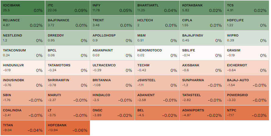 ICICI Bank, ITC, Infosys, Bharti Airtel, and Kotak Bank were the top five contributors to the Nifty 50 on October 07.