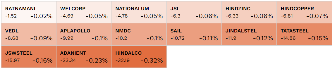 All the constituents of the NIty Metal index were trading in the red. Hindalco and Adani Enterprises are contributing most to the drag of Nifty Metal.