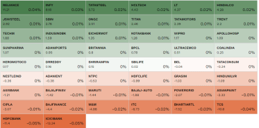 As of 3:20 PM, the top gainers on the NSE included Trent, up by 2.74%, followed by Hindalco with a 2.29% rise, HCL Tech gaining 1.66%, Tech Mahindra up 1.61%, and ONGC increasing by 1.23%. On the losing side, TCS dropped 1.82%, M&M fell 1.76%, ICICI Bank declined 1.62%, Maruti slipped 1.38%, and Cipla was down by 1.26%.