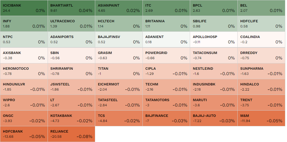 Reliance Industries, HDFC Bank, M&M, Bajaj Auto, and Bajaj Finance were the major contributors to the fall of Nifty 50 on October 15.