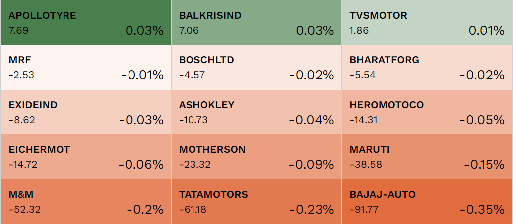 Bajaj Auto, Tata Motors, M&M, Maruti Suzuki, and Samvardhan Motherson were the major contributors to the fall of Nifty Auto on October 15.