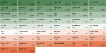 On the other hand, Bajaj Finance experienced the most significant loss, falling 2.85%. Hindustan Unilever followed with a decline of 2.68%, while Bajaj Finserv decreased by 2.19%. SBI Life and Britannia also saw losses, dropping 1.44% and 1.12%, respectively.