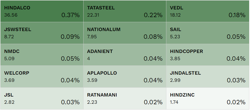 Top gainers among Nifty metal stocks include National Aluminium, which rose by 4.23%, followed by Steel Authority of India Limited (SAIL) with an increase of 3.24%. Hindalco also saw gains of 2.87%, while Ratnamani Industries climbed by 2.17%, reflecting positive momentum in the sector.
