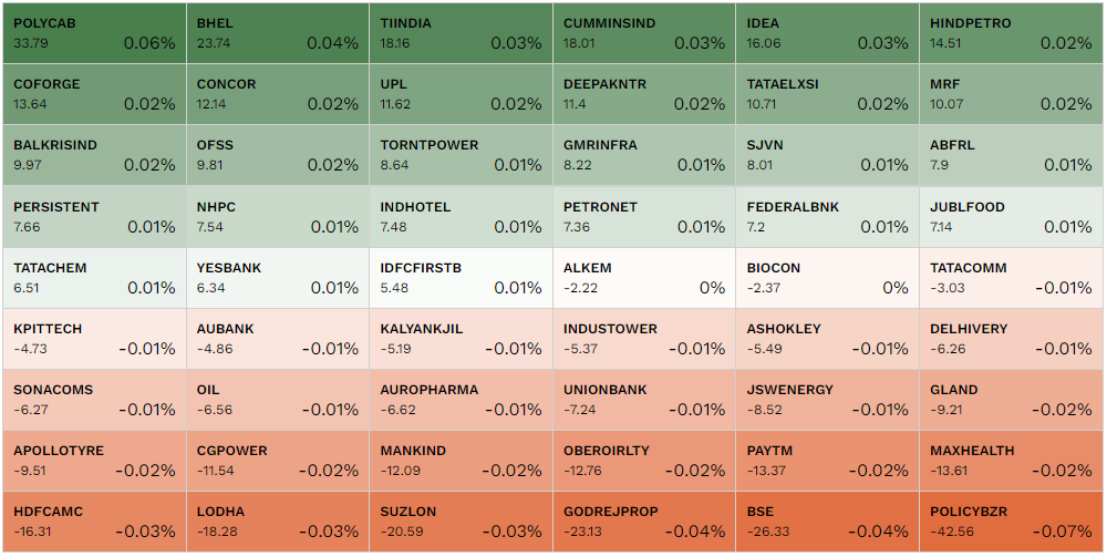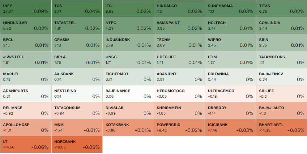 At 3: 157pm, the top gainers on the NSE were BPCL, leading with a 6.32% surge, followed by Cipla (2.82%), Sun Pharma (2.77%), Hindalco (1.82%), and Reliance (1.80%). On the other hand, the top losers included Power Grid, down by 3.16%, Bharti Airtel (-2.47%), Kotak Mahindra Bank (-1.76%), Hero MotoCorp (-1.65%), and ICICI Bank (-1.63%).