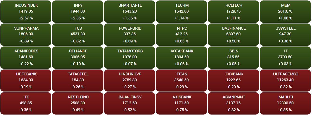 On the NSE, the top gainers were LTI, which jumped 6.54%, followed by Wipro with a 3.48% rise. IndusInd Bank gained 2.65%, Infosys advanced 2.32%, and Bajaj Auto increased by 1.49%.