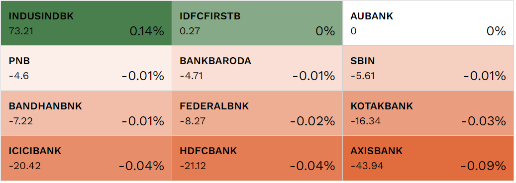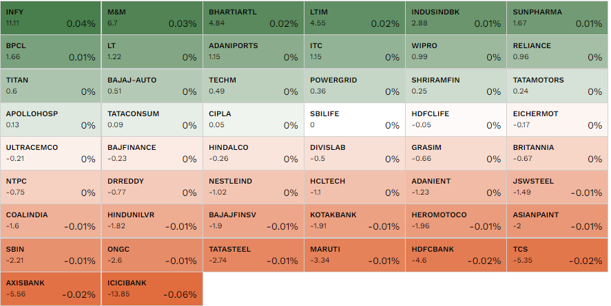On the losing side, Hero Motocorp led with a decline of 1.40%, followed by Asian Paints, which dropped 1.03%. Axis Bank fell by 0.84%, while Nestle India and Britannia were down by 0.77% and 0.73%, respectively.
