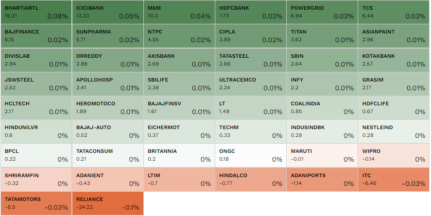Bharti Airtel, ICICI Bank, M&M, HDFC Bank, and Power Grid Corp were the top contributors to the Nifty 50.