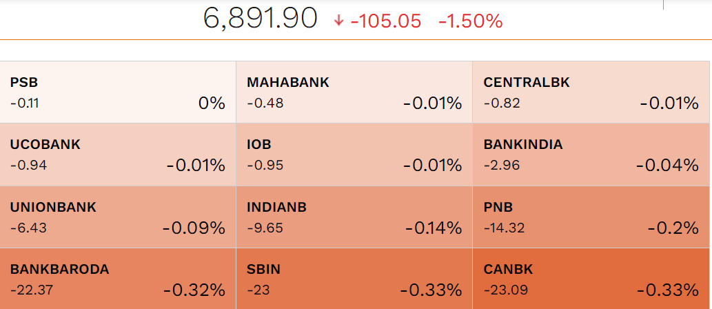 Top losers among Nifty PSU Bank stocks included Indian Bank, which fell by 2.65%, followed by Canara Bank, down by 2.50%. Bank of Baroda declined by 1.93%, while Punjab National Bank (PNB) and Punjab & Sind Bank (PSB) dropped by 1.51% and 1.47%, respectively.