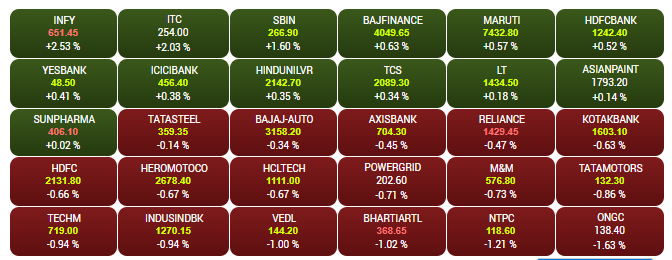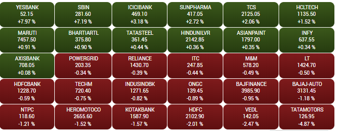 The headline indices Sensex and Nifty registered their second best Samvat in 4 years, even as the stock market remained volatile through the year. The Sensex closed Samvat 2075 12% higher and Nifty ended the session about 10% up. The Sensex closed Friday's session 38 points higher at 39,058; while the Nifty closed the session 2 points up at 11,584. Yes Bank, SBI, ICICI Bank, Sun Pharma were among the biggest gainers, surging up to 8%. Tata Motors, VEDL, HDFC were among the biggest losers, shedding up to 5%. A look at LIVE Sensex heatmap.