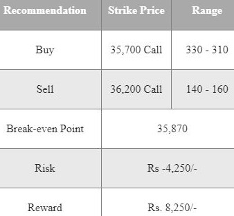 Rationale: Traders could initiate this spread strategy to make modest returns with limited risk and reward. The spread suggested consists of buying one lot of 35,900 strike CALL Option and simultaneously selling one lot of 36,400 strike CALL Option. (Axis Securities)