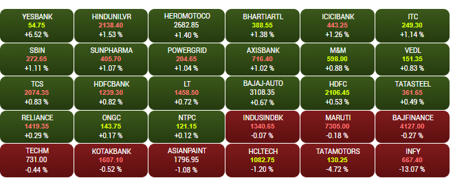 Infosys shares dragged the headline indices lower on Tuesday afternoon, after whistle blower complaints led to its biggest one-day fall in over 6 years. Infosys shares closed the session 16.21% lower at Rs 643.30 on BSE. The Sensex ended 335 points lower at 38,964, while the Nifty closed the session 52 points lower at 11,589. A look at LIVE Sensex heatmap.